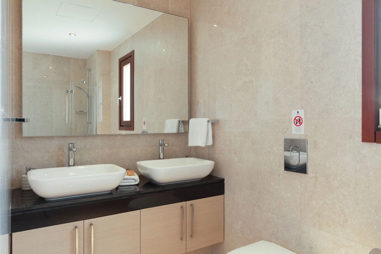 Upstairs, the spacious master bedroom suite is beautifully fitted with parquet floor and features attractive drapes and soft furnishings. Furnished with a king size bed, TV, dresser and matching side tables it offers a private balcony offering extensive sea views. The en-suite bathroom is fitted with twin wash basins in a marble vanity unit, and bath/shower combination.