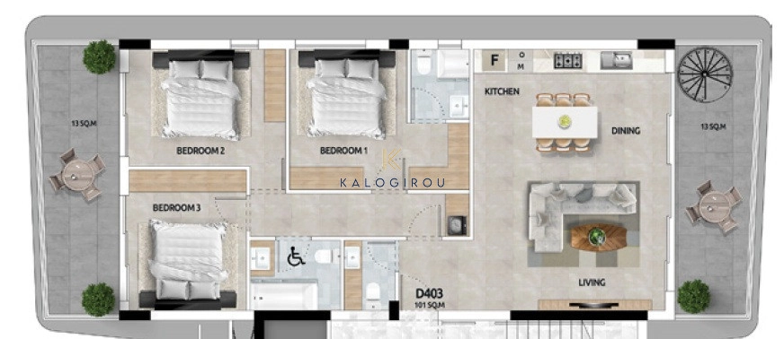 Top Floor Apartment for sale in Livadia area, in Larnaca. The apartment consists of a living, dining, kitchen area as an open space, a main bathroom with shower, three bedrooms, master bedroom is en suite with shower, covered balcony and roof garden. The roof garden comprised of the veranda, a shower, 1 wc and storage room. Moreover, the residents have exclusive right of use to a covered parking on the ground level.