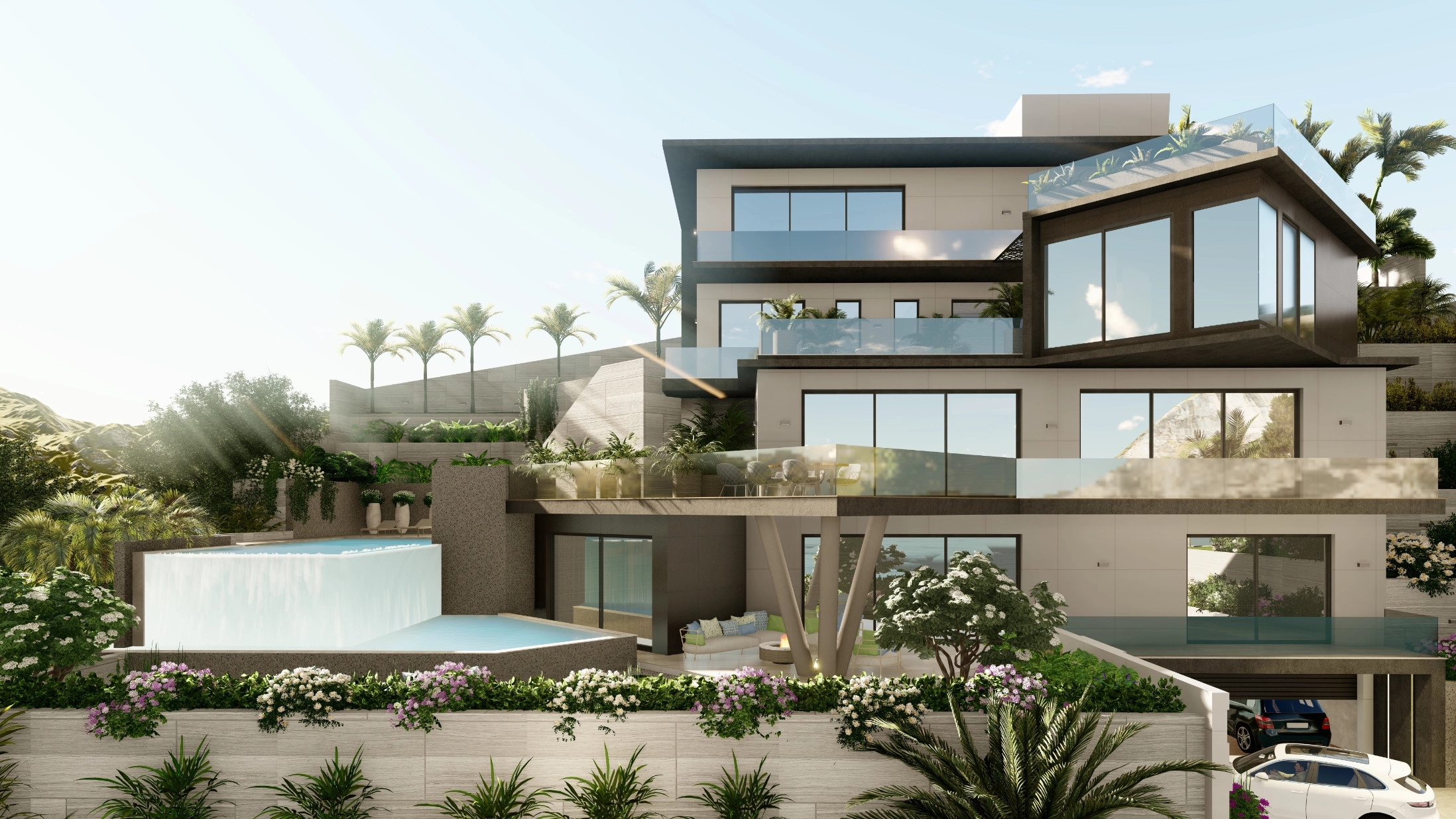 Features: Electric elevator, overflow swimming pool, gym, sauna, photovoltaic panels, central VRV A/C system, underfloor heating, fireplace, BBQ area, and secure garage with covered parking.