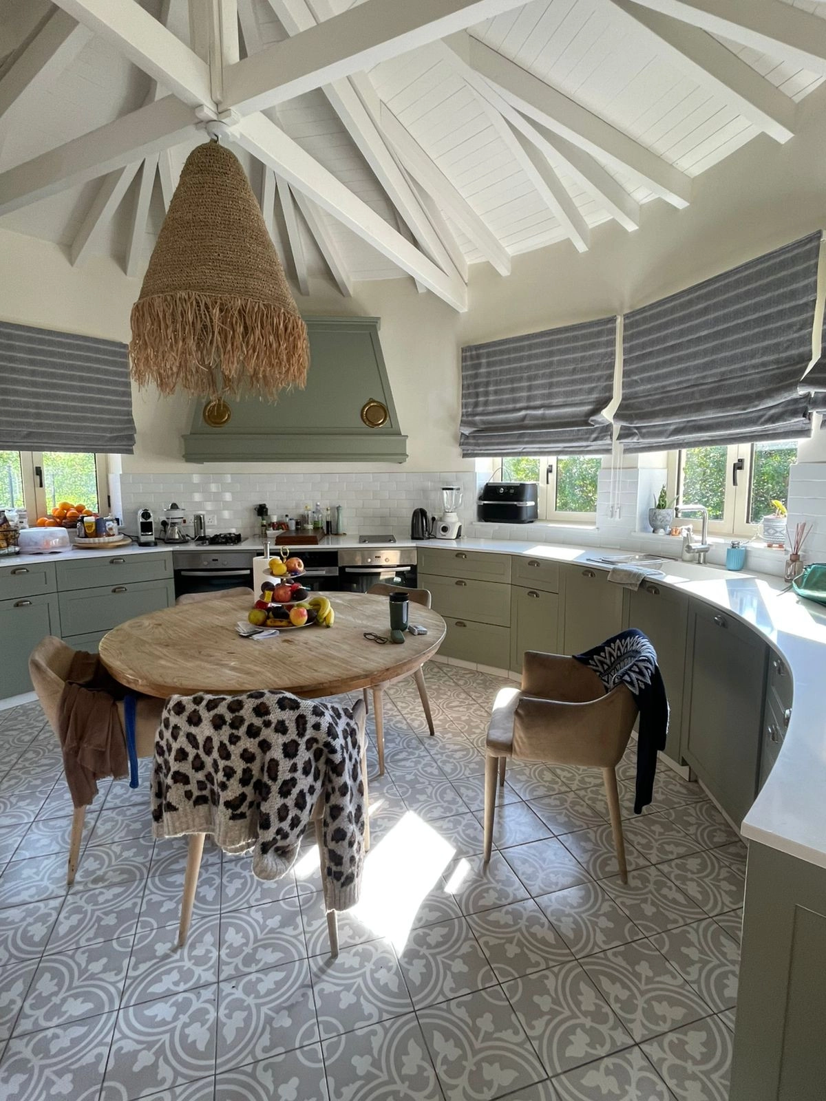 Unique circular kitchen design with a vaulted timber roof, granite cooking range, and bespoke oak units and worktops
