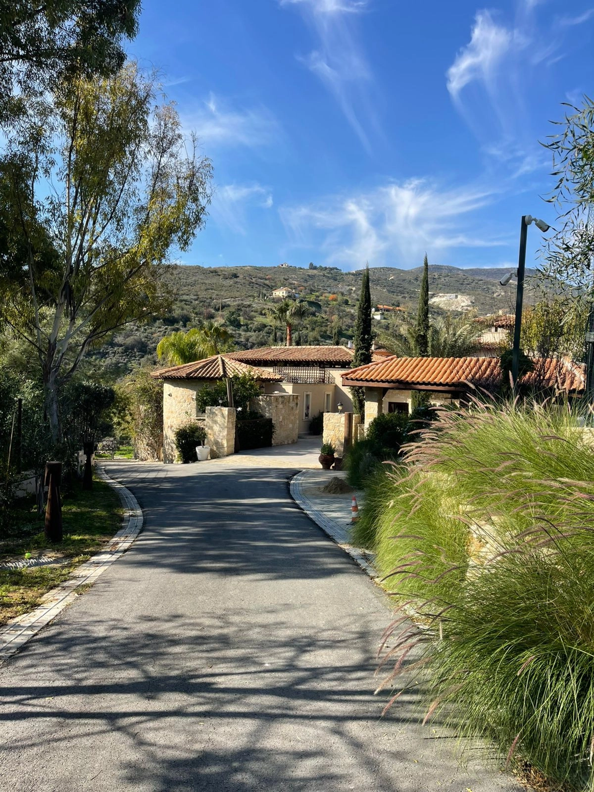 Private driveway leads to the villa, lined by mature trees and passing alongside a semi-dry riverbed