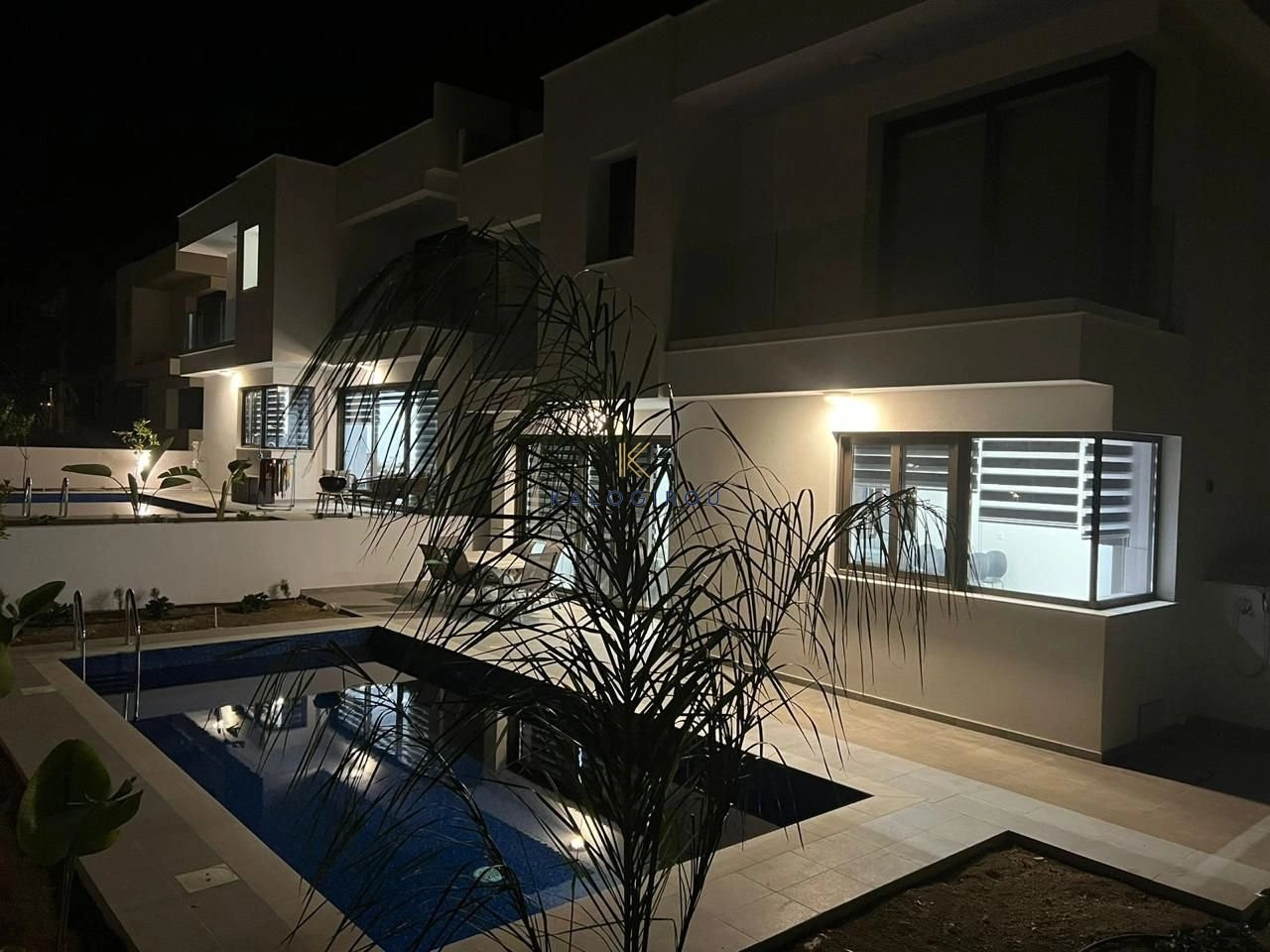 Double Storey Semi-Detached House for sale in Larnaca, Pyla area. The house has internal covered area of 200 sq m approx. in a plot of 324 sq. m. On the ground floor it consists of an open plan kitchen, dining area and living room, a guest wc and covered veranda of 20.65sq m. On the first floor it consists of 3 bedrooms, two of them en-suite with shower and wc and a main bathroom with shower and w/c too. On the top there is a beautiful roof garden of 80 sq m with fantastic view. Externally there is green area and private swimming pool.