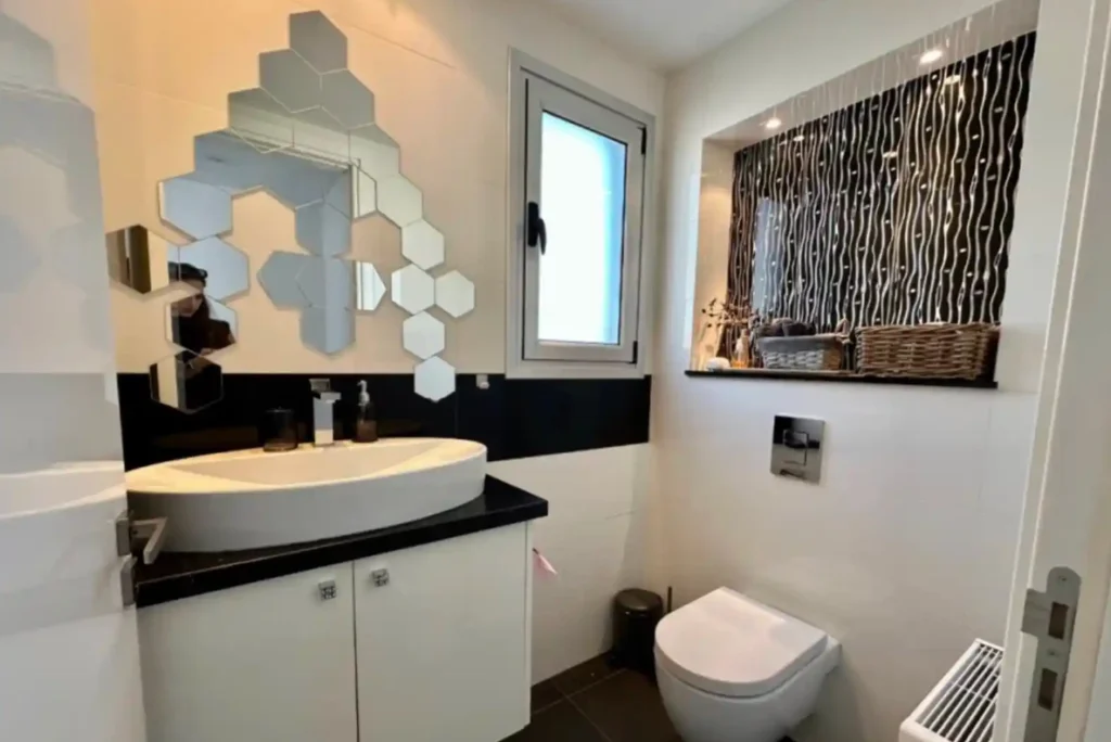 Main bathroom (1st floor) with shower and a corner bath.