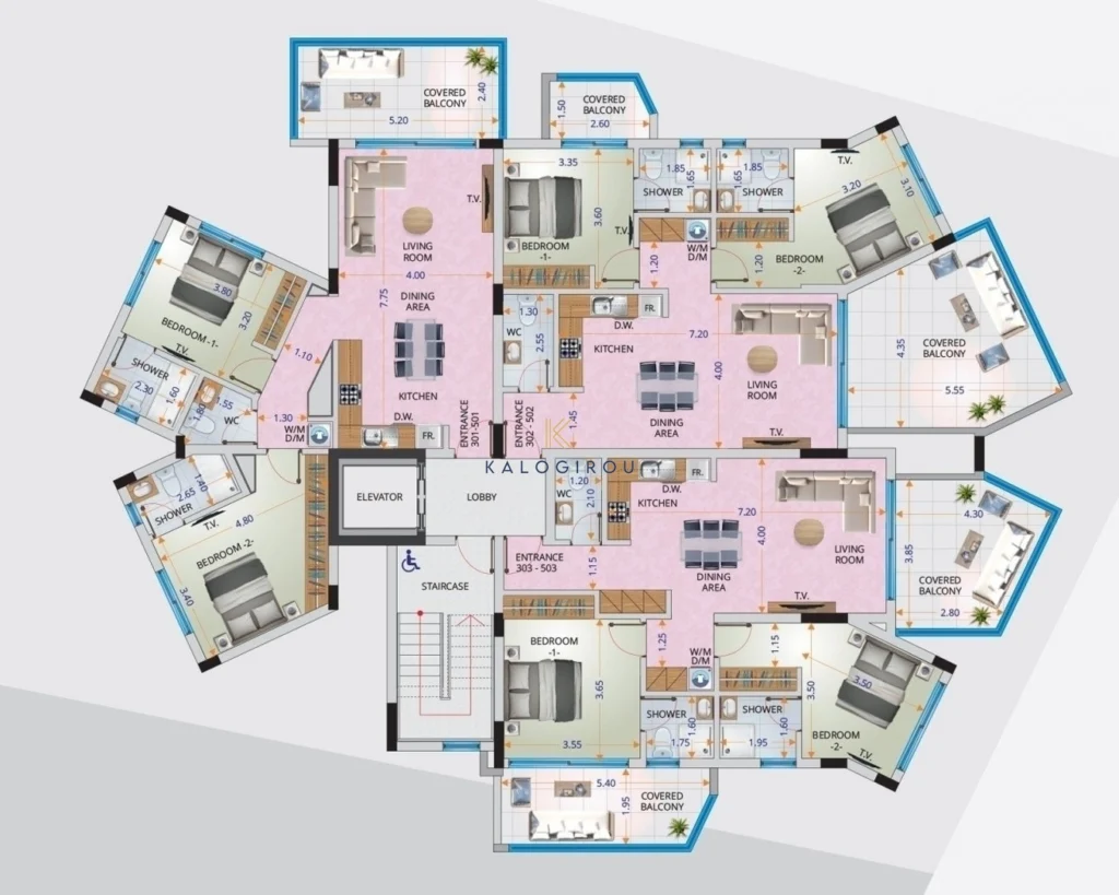 The project will compose of twenty spacious apartments. All energy efficient luxury apartments are designed to have large living areas and balconies along with large bedrooms including en –suite shower rooms and walk-in wardrobes. At the first and second floor will be six apartments of one bedroom and one apartment with 2 bedrooms. From third to sixth floor will be three apartments with 2 bedrooms and 2 bathrooms. The three sixth floor apartments of the project will have a private and luxurious penthouse with α magical panoramic view.