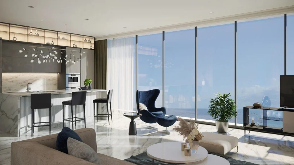 The project is luxury high-rise comprises retail and office space on the ground and mezzanine floors, and 12 floors of residences, including a penthouse, all overlooking the azure blue waters of the Mediterranean. Its location across from the famed Blue Flag sandy beach of Dasoudi means that the golden coastline is never more than a few steps away. The property is ideally situated in a bustling hotspot that is perfect for both shops and offices looking to be in the middle of the action, as well as for residents who wish to fully indulge in all the perks of island living, with a host of amenities at their fingertips.