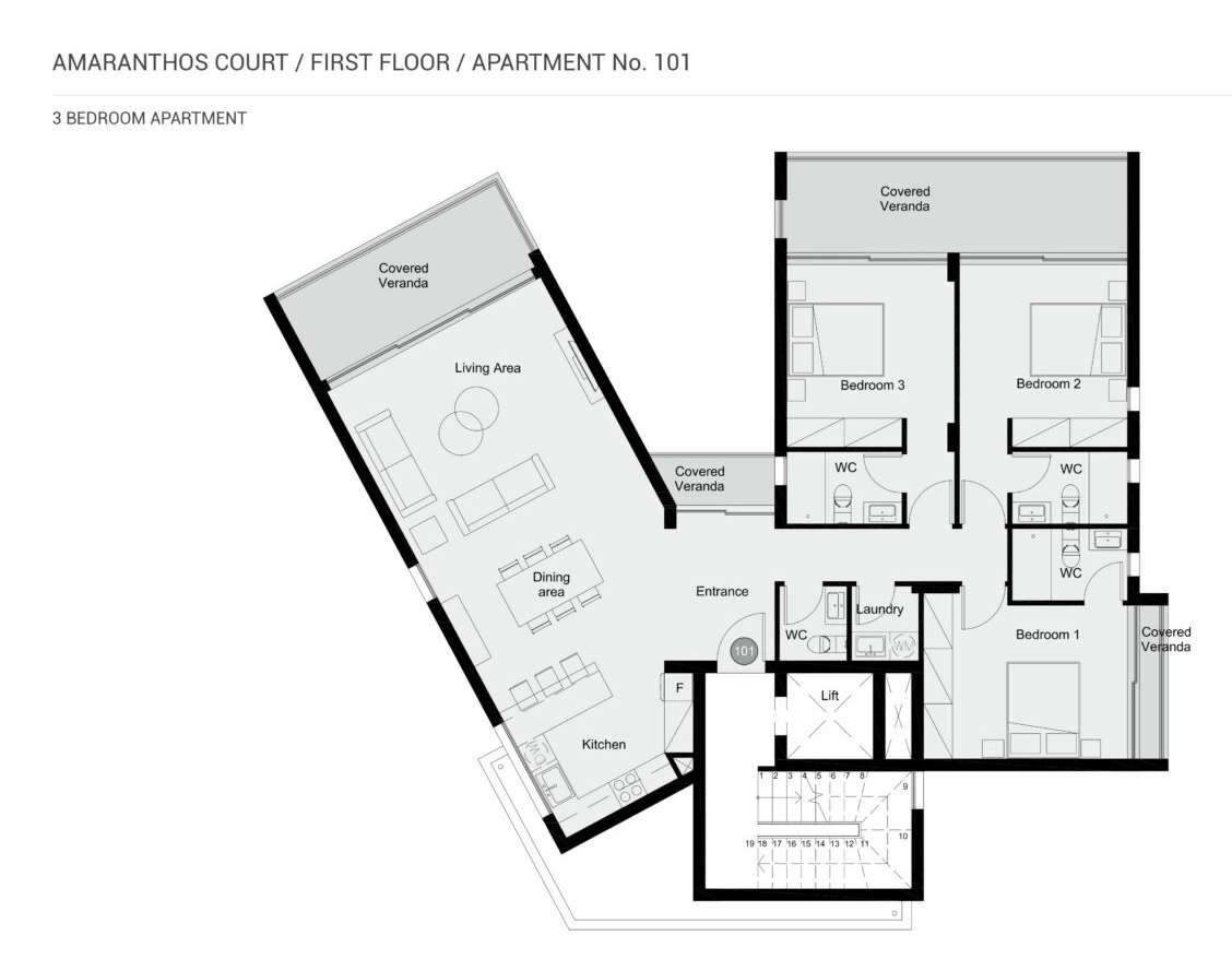 The building’s modern lines and V-shape top view provide a unique character on its looks. There are 3 floors in total, each one with one with a 3-bedroom apartment. The indoors of each apartment are very spacious, with an open plan space between the kitchen, dining area and living area. All bedrooms have en-suite WC and bathroom and have access to a covered veranda. All apartments are identical in layout apart from the penthouse which enjoys a large uncovered & semi covered roof terrace. Each apartment is complemented with a laundry room, guest WC and access to the lift, covered parking and storage area.