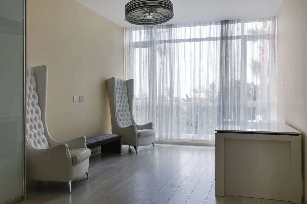 The fully-equipped kitchen is a chef’s dream, featuring high-end appliances, sleek cabinetry, and a breakfast bar. Adjacent to the kitchen, you will find a cozy family room with a spacious sitting area, creating the perfect space for relaxation and intimate gatherings.