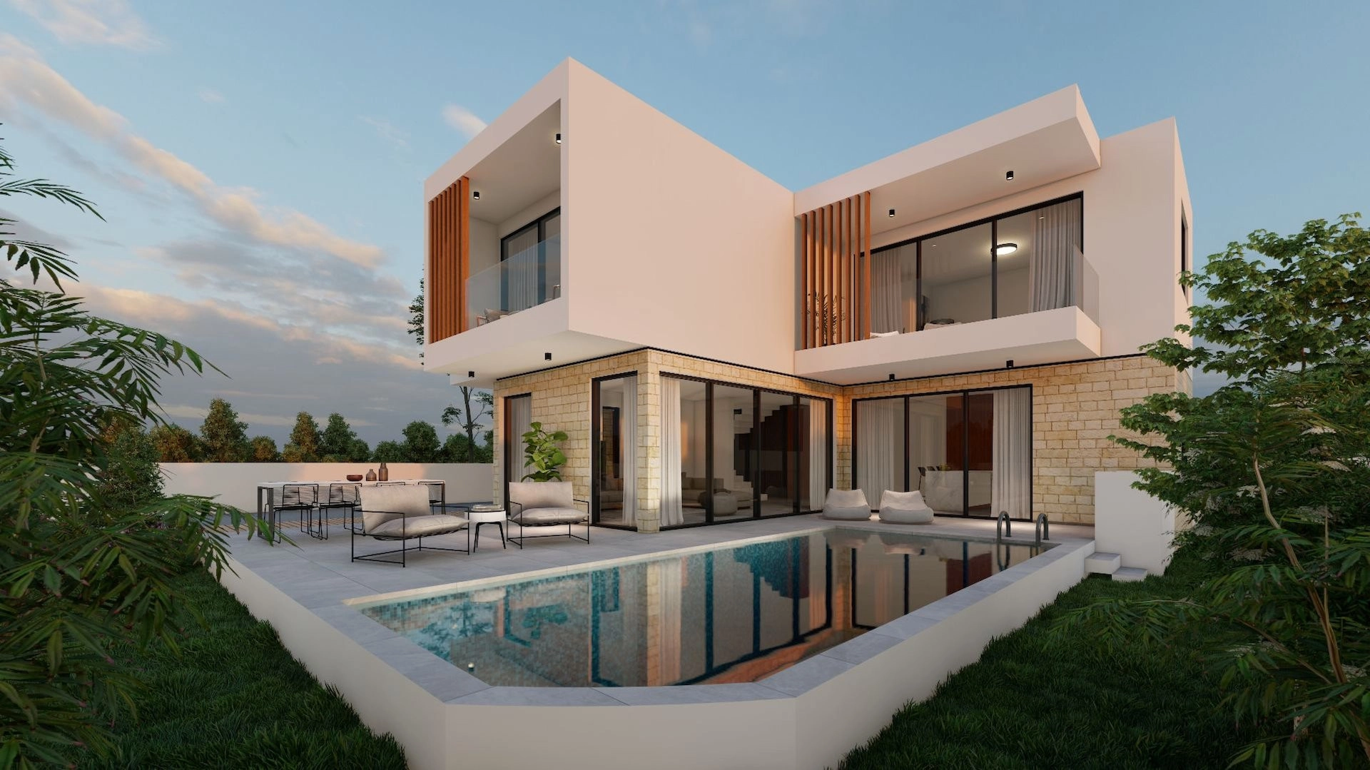 Our modern 4-bedroom and 5-bathroom villa, covering over 237sqm on a 582sqm plot, features open-plan living and luxurious bedrooms with balconies overlooking the sea.