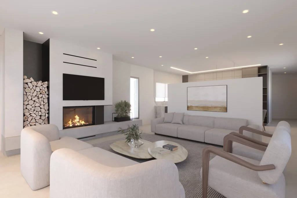 The one-bedroom apartment offers a perfect blend of elegance and functionality. An open-plan living area with a modern kitchen creates a bright and welcoming atmosphere, while large windows frame city or sea views. The bedroom is designed as a private retreat, complemented by a contemporary bathroom featuring walk-in shower, chrome brassware, and illuminated vanity unit.