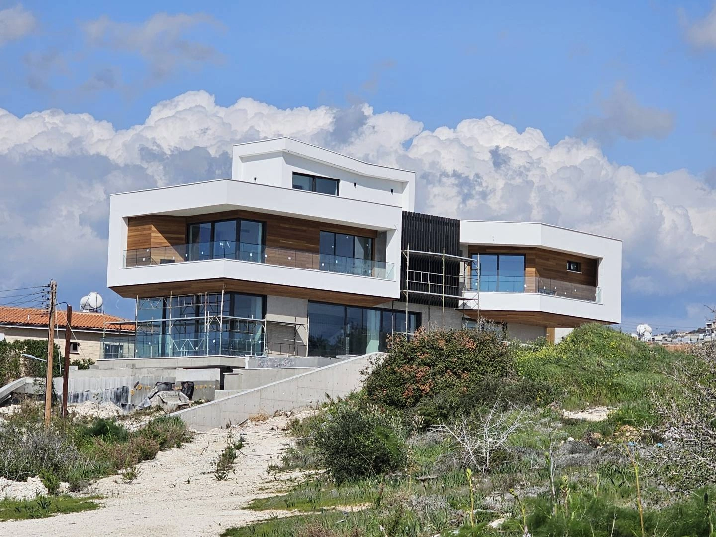 For sale a four-bedroom villa under construction (+ studio on the ground floor) in Konia (Paphos). Construction using the most modern materials. A large plot of 750 m2. Three floors. Panoramic sea view from all rooms. The wine room. Underfloor heating is everywhere. Elevator. Swimming pool. The smart home system. Supply ventilation. The sea is 4000 m away. Huge parking lot.