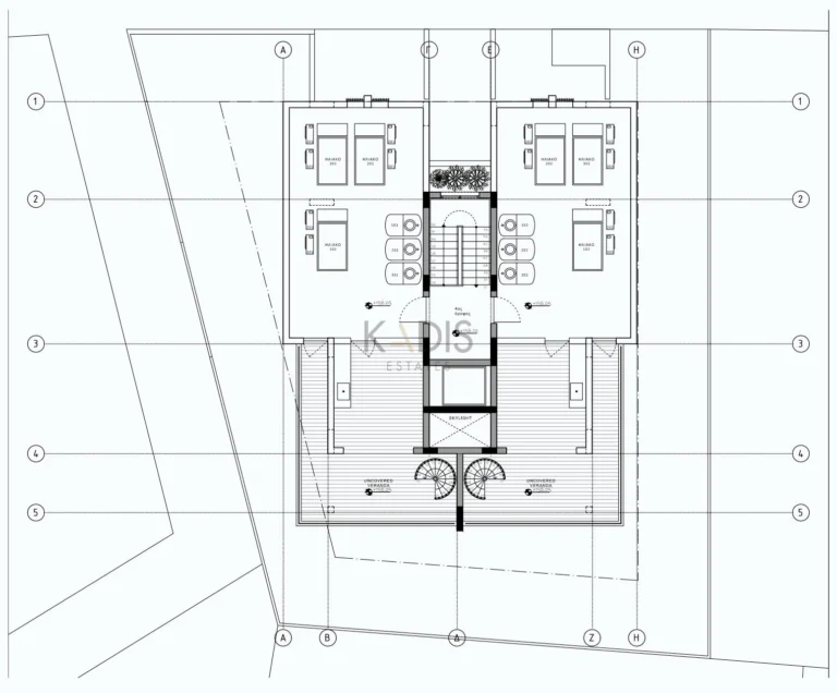 The building is developed over three levels with ground floor/pilot and roof, housing two-bedroom apartments on all levels, with access to the roof from the 3rd floor via a metal spiral staircase. Each floor comprises two apartments, each with open living space and two bedrooms, bathroom and guest wc.