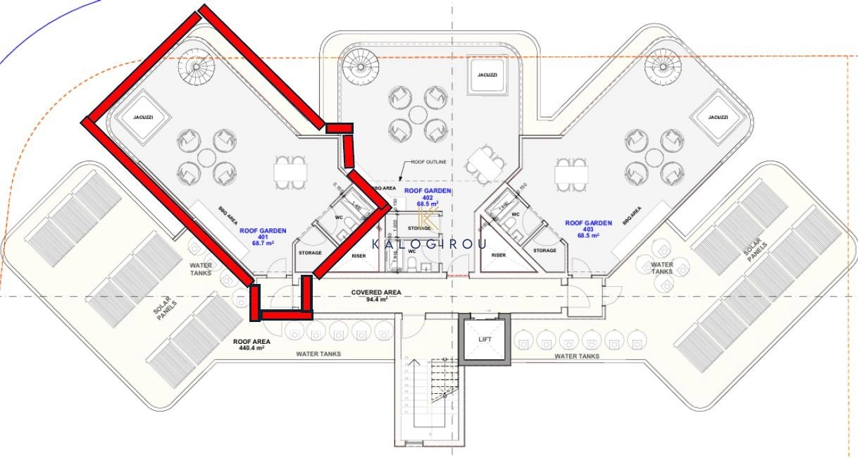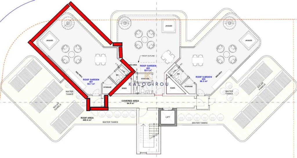 Top Floor Apartment for sale in Livadia area, Larnaca. The property is situated on the fourth floor and consists of an open plan kitchen, dining area, living room, a main bathroom (shower), two bedrooms, master is en suite with shower, covered veranda and a spacious roof garden. The roof garden consists of the veranda, storage room and bbq area. For the roof garden, there is provision for a jacuzzi and bathroom. The property offers also covered parking space on the ground floor and storage.