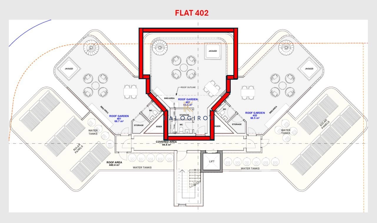 Top Floor Apartment for sale in Livadia area, Larnaca. The property is situated on the fourth floor and consists of an open plan kitchen, dining area, living room, a bathroom with walk in shower, one bedroom, covered veranda and a spacious roof garden. The roof garden consists of the veranda, storage room and bbq area. For the roof garden, there is provision for a jacuzzi and bathroom. The property offers also covered parking space on the ground floor and storage.