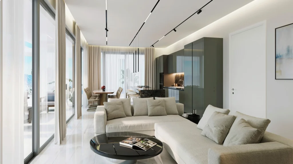 Inside, the apartment features an open-plan configuration with a generous living and dining area, complemented by premium flooring and designer finishes. The kitchen is fitted with high-quality cabinetry and contemporary appliances that blend style and efficiency. Bedrooms offer ample space, full-height windows, and bespoke wardrobes, while bathrooms are appointed with luxury sanitary ware from top European brands.