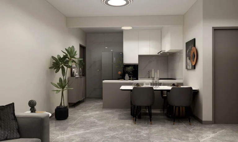 The apartment’s open-concept living area is enhanced by expansive windows that invite natural light and garden views into the home. The kitchen is well-appointed with contemporary finishes and smart storage solutions, while the living and dining areas extend to a private balcony or terrace, ideal for indoor-outdoor living.