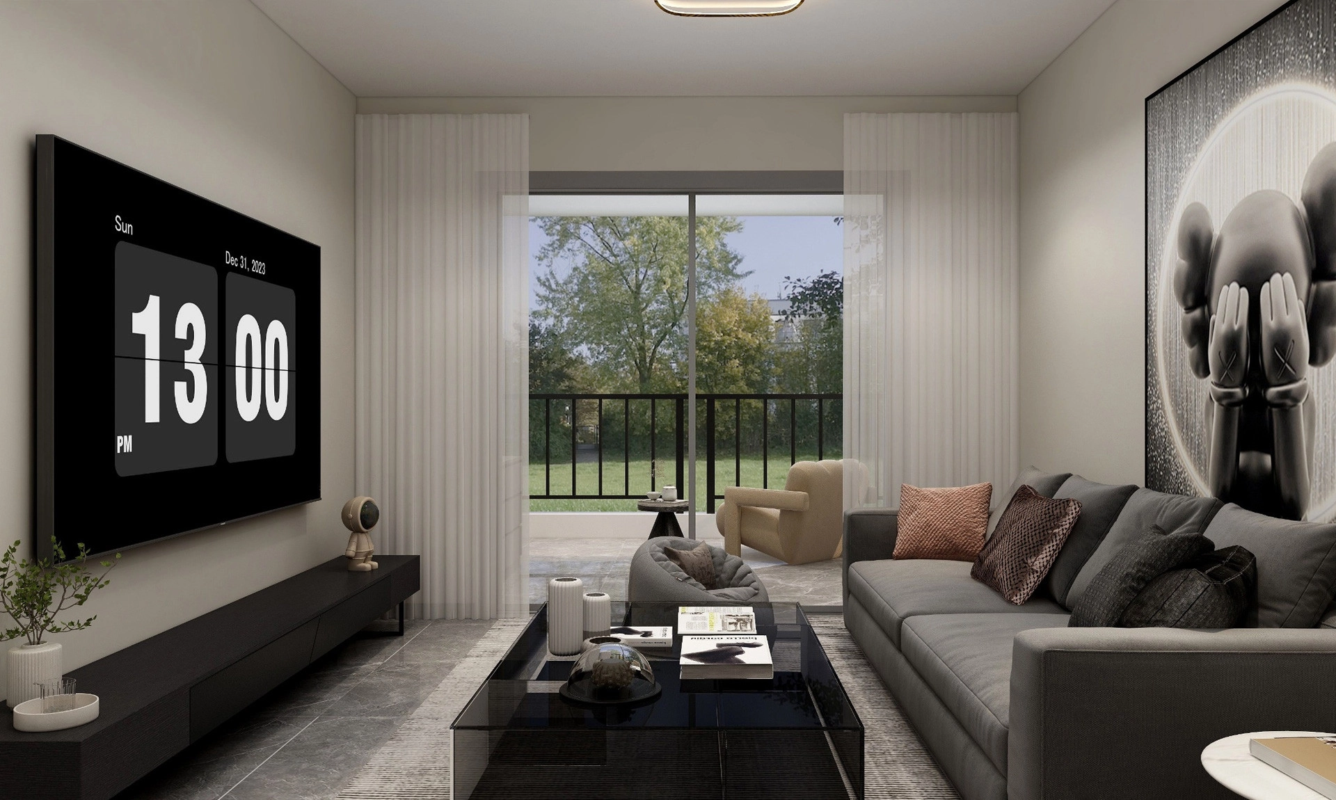 The interior features a light-filled layout with floor-to-ceiling windows and a seamless flow between the kitchen, dining, and living areas. Both bedrooms are spacious and thoughtfully positioned for privacy, while the elegant bathroom and guest WC add comfort and practicality. High-quality finishes, sleek cabinetry, and soft-toned materials create a sense of understated luxury throughout.