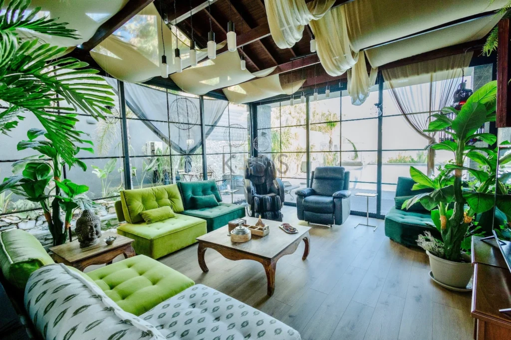 • Elegant relaxation room overlooking a tranquil koi pond