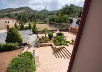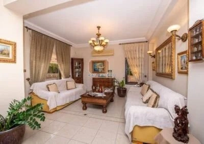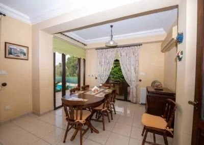 Set on an elevated 1,800 m² plot, the property boasts breathtaking mountain and countryside views. The 400 m² home features spacious interiors with high-end finishes, including marble floors and deep-colored wood. Upon entering, you are welcomed by two elegant living and dining areas separated by a grand archway. A beautifully crafted wooden bar adds a touch of sophistication, perfect for entertaining. The fully equipped kitchen includes a central island, a casual dining area, and a separate utility room.