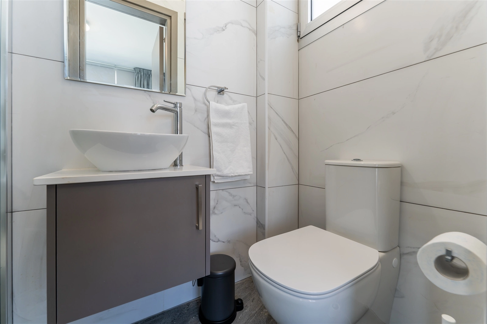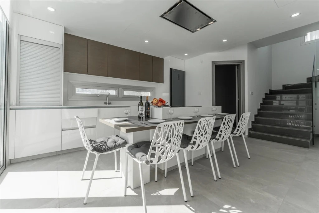 The ground floor welcomes residents into an open-plan living and dining area, seamlessly connected to a designer kitchen with a central island and access to the private garden and pool. A guest suite with an en-suite bathroom and independent access offers both comfort and flexibility, perfect for visitors or extended family.