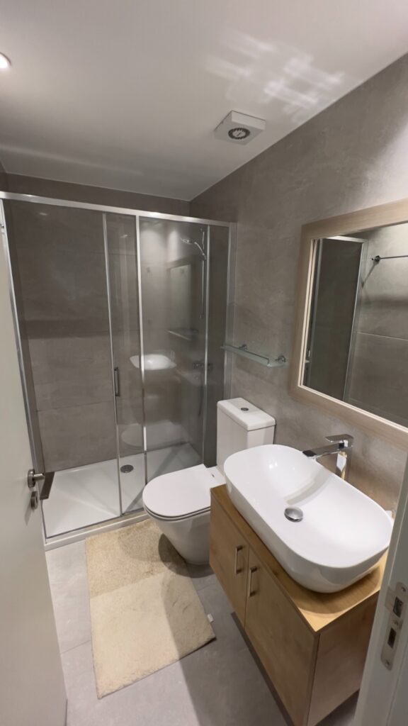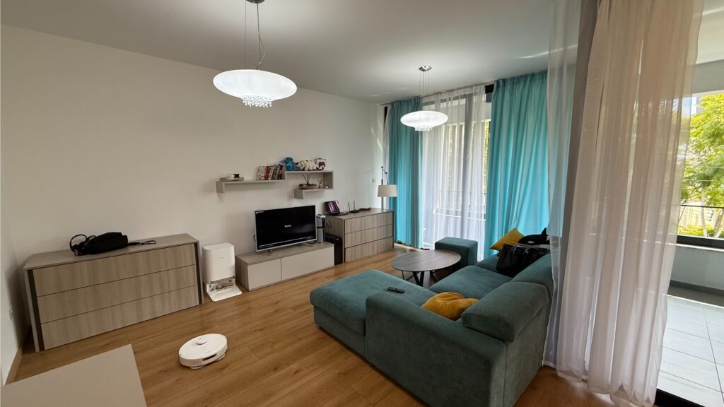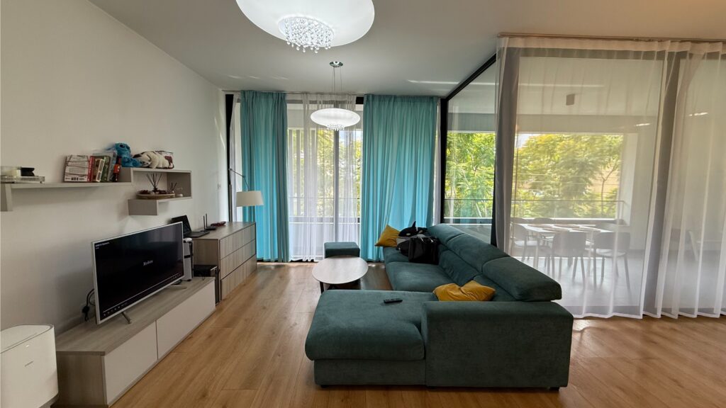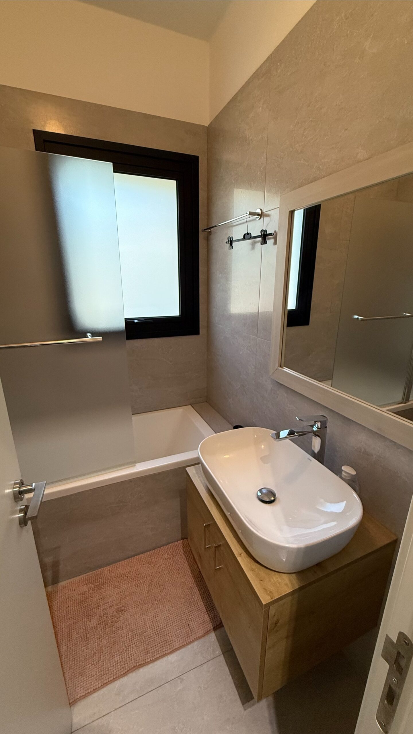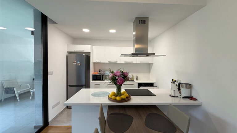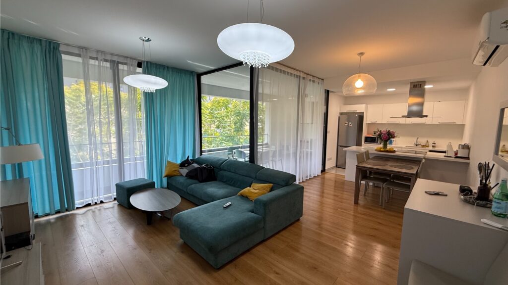 The three-bedroom apartment is located on the 2nd floor, with an amazing view on the trees, in the area of Makariou, 1km from the beach, close to all amenities such as supermarket Sklavenitis, schools, restaurants, business centers. The covered area is 102sq.m and the covered veranda is 25sq.m. There are 3 bedrooms, a fully equipped kitchen with a dishwasher, and 3 bathrooms (one ensuite shower, 1 family bathroom, 1 guest WC). A/c in all rooms, solar panels for hot water, double-glazed windows, and electrical shutters. Built in 2020. Also, there is a covered parking and storage room in the parking area.