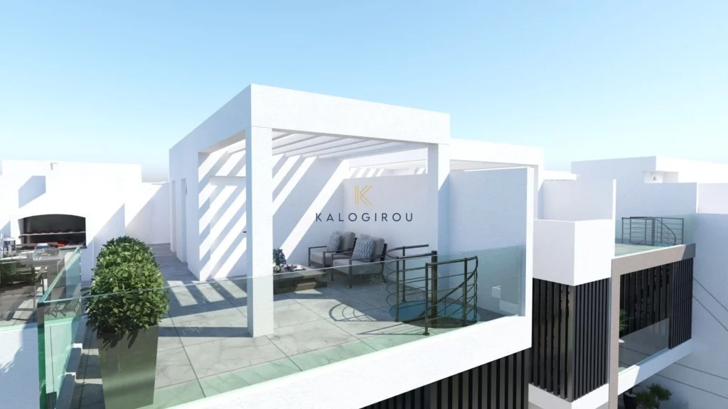 Apartment for Sale in Aradippou area, Larnaca. This beautiful apartment consists of an open plan kitchen and living room with dining area, two bedrooms, one common bathroom with wc and one en suite shower in the master bedroom. The apartment enjoys a private roof garden with sitting area and toilet. Also, the apartment has a storage room and covered parking space on the ground floor.