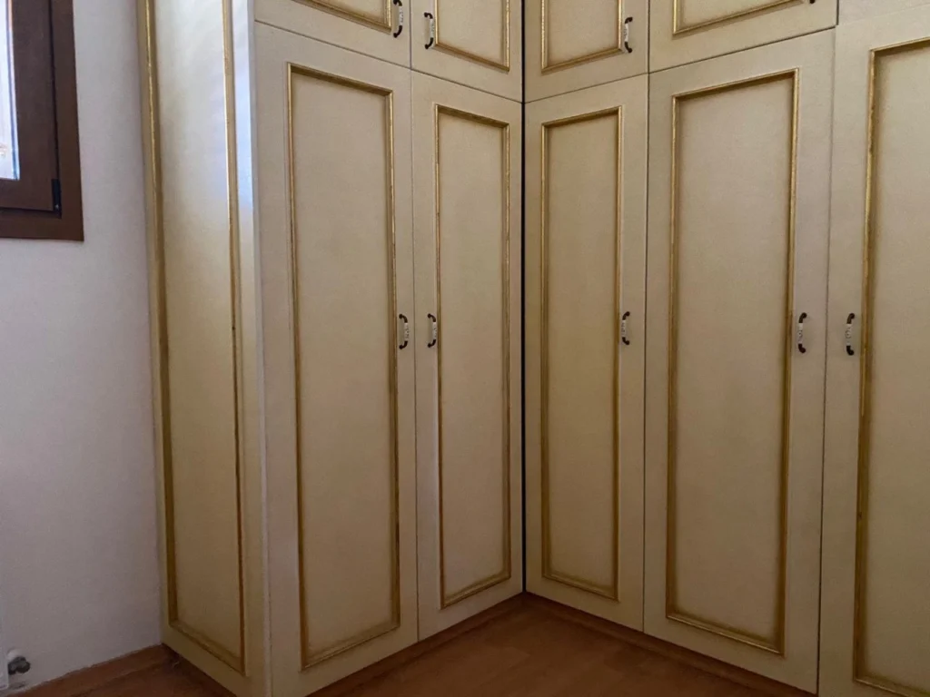 The exterior courtyard is paved with cobblestones and includes a swimming pool (approx. 32 m²), a covered parking area, and a well. The landscaped plot is beautifully maintained, adorned with mature plants (including palm trees), and fully fenced. The driveway is asphalted.