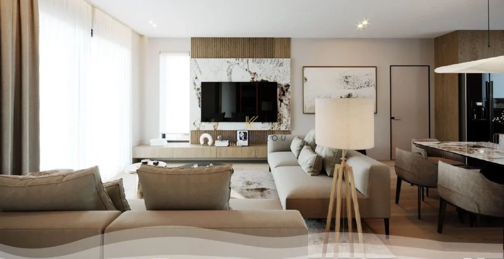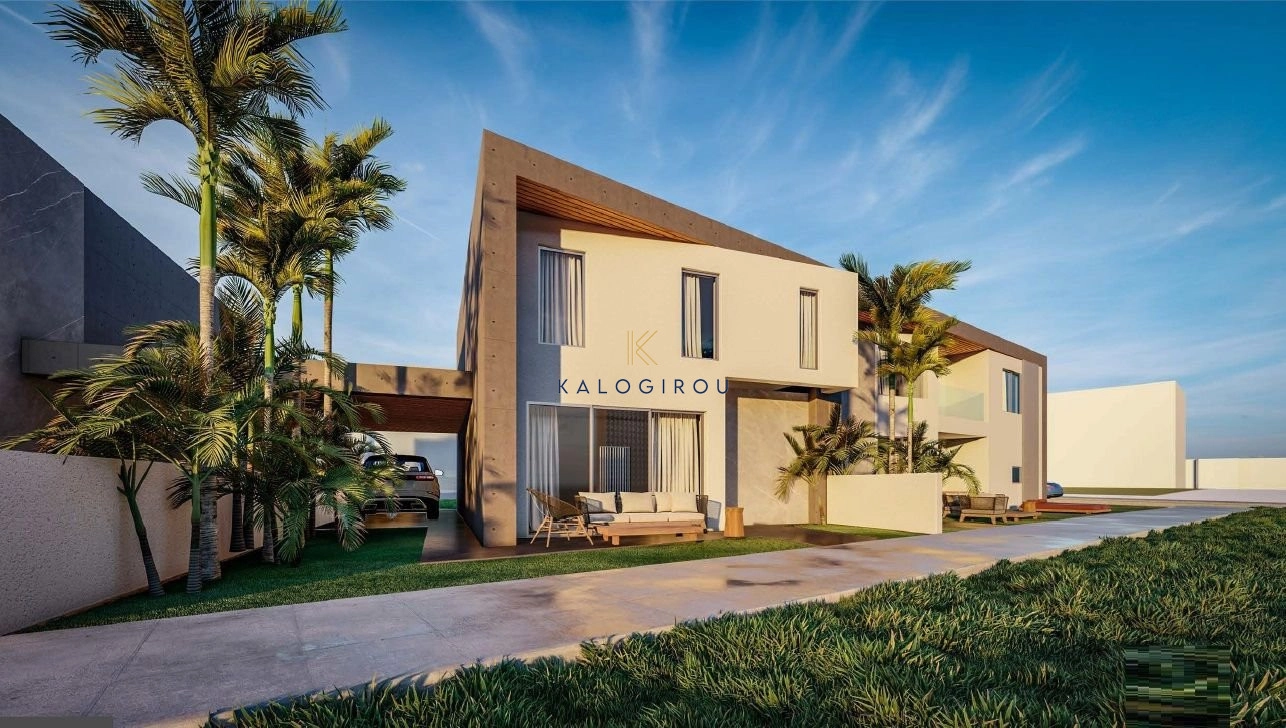 The house is a part of a new residential complex of three houses. The wider area is residential and the houses are surrounded with large green area. Each house comprises of a modern internal layout with open plan design for living/dining areas, kitchen and guest toilets on the ground floor and on the first units three bedrooms each the master en suite. Externally you can enjoy under the sun moments of relaxation and calmness in uncovered verandas.