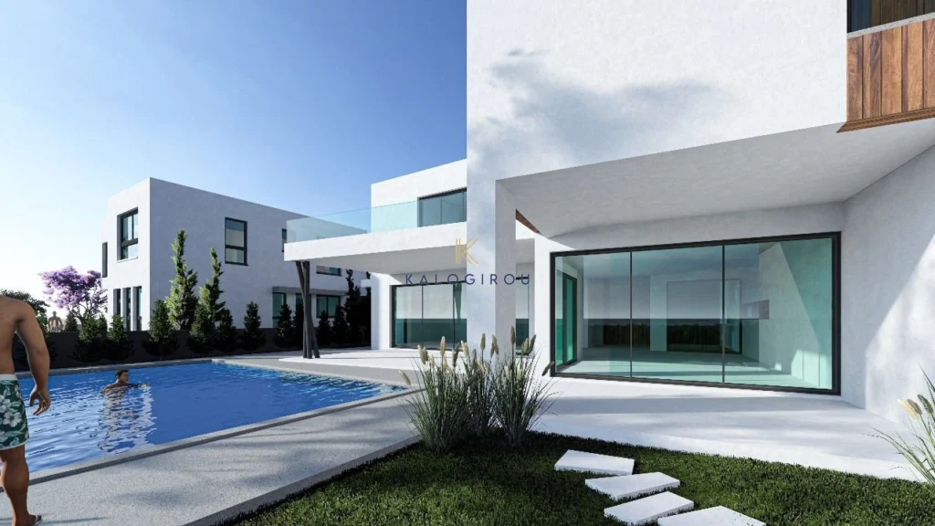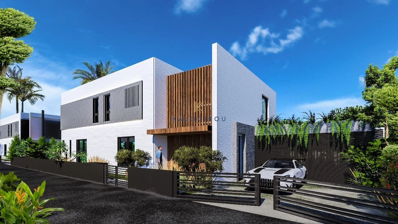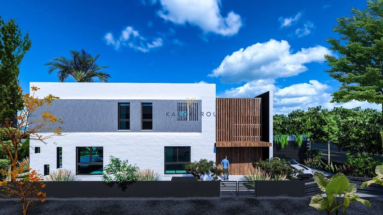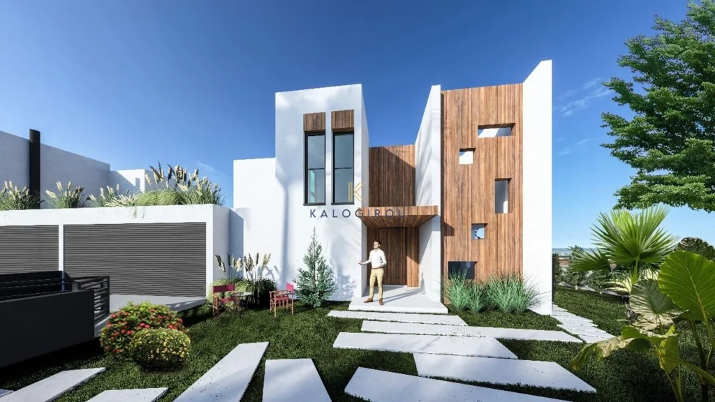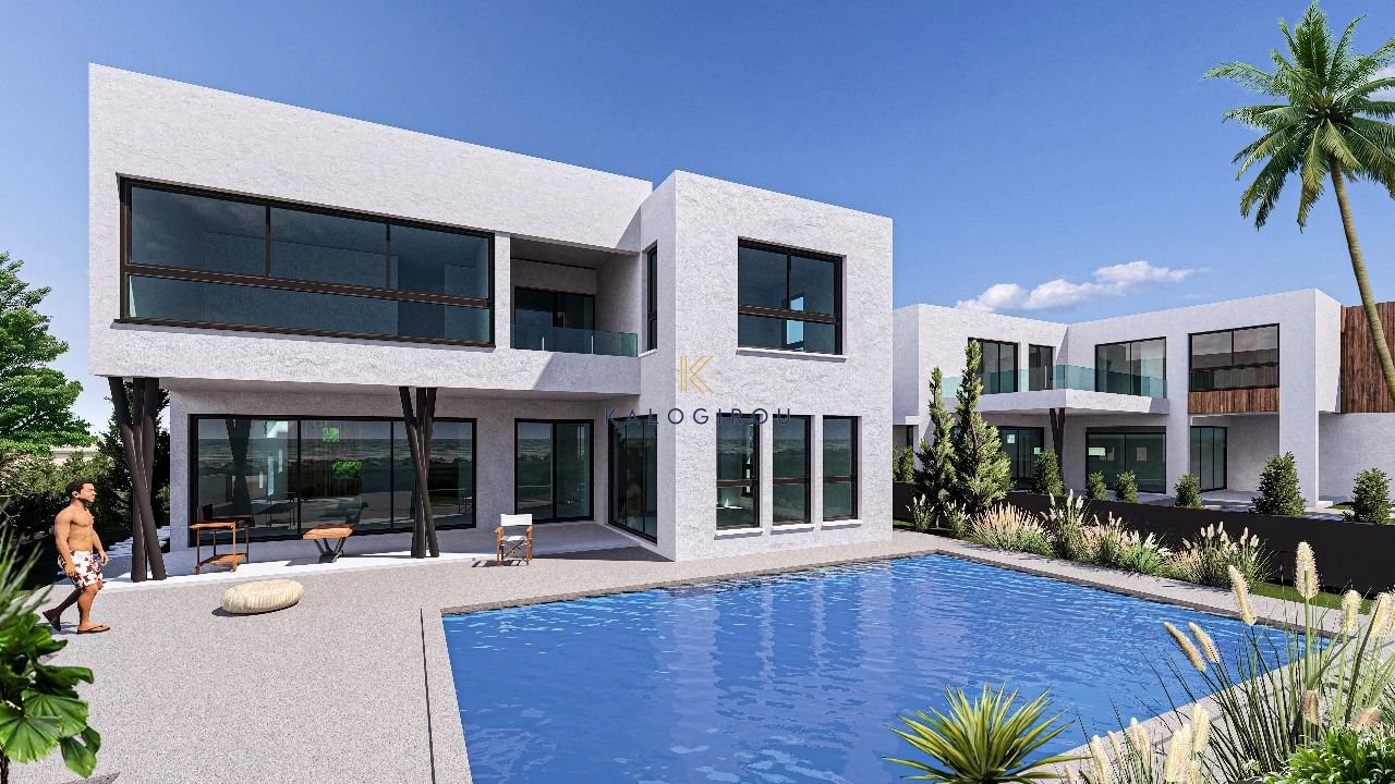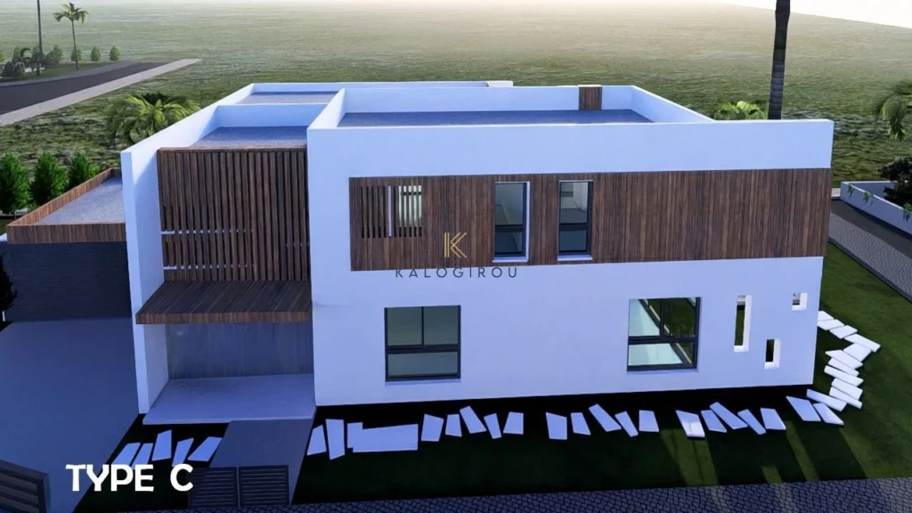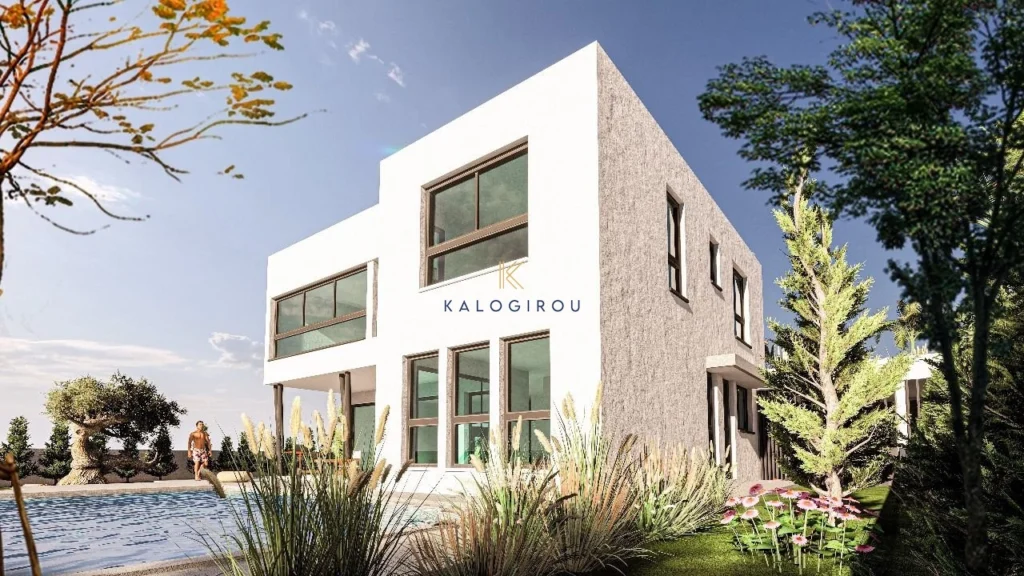 Double Storey Modern House for sale in Larnaca, Pervolia area. The ground floor consists of an open plan space of kitchen with living and dining area area, guest toilet, storage room and boiler room. The first floor comprises of three bedrooms, each bedroom has en suite shower with wc. Also, the first floor has a kitchenette and space of sitting area. Externally there is a spacious garden area with private swimming pool.