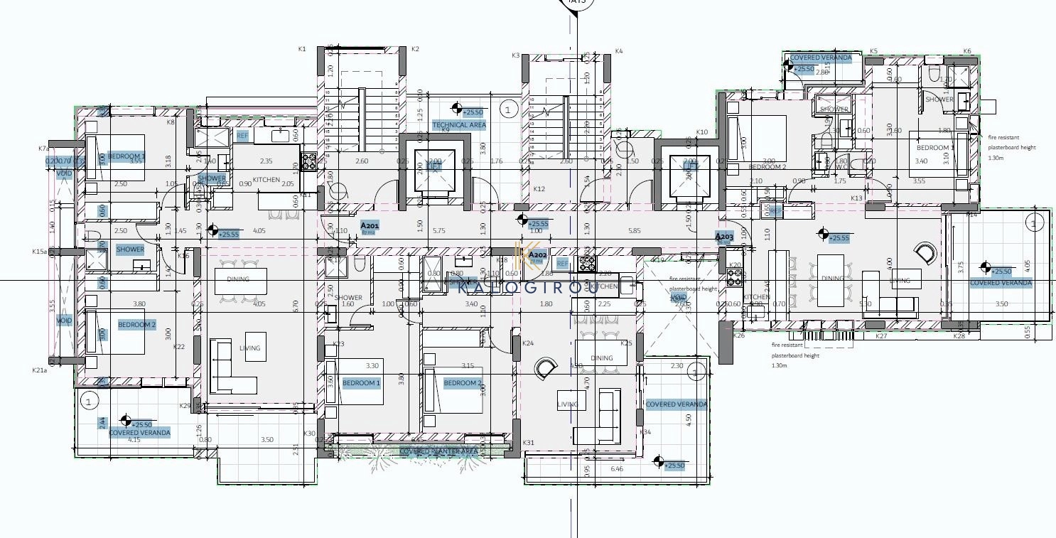 The apartment consists of an open plan kitchen with living & dining area, a main shower with wc and two bedrooms the master en-suite. It offers covered veranda, storage room and private parking space on the ground floor. The large roof garden on the top gives you a breathtaking scenery that you will never forget.