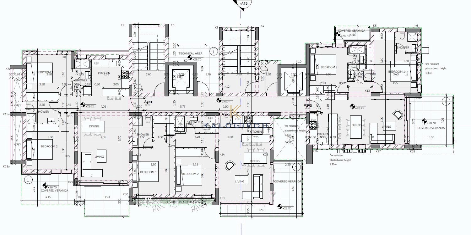 The apartment consists of an open plan kitchen with living & dining area, a main shower with wc and two bedrooms the master en-suite. It offers covered veranda, storage room and private parking space on the ground floor. The large roof garden on the top gives you a breathtaking scenery that you will never forget.