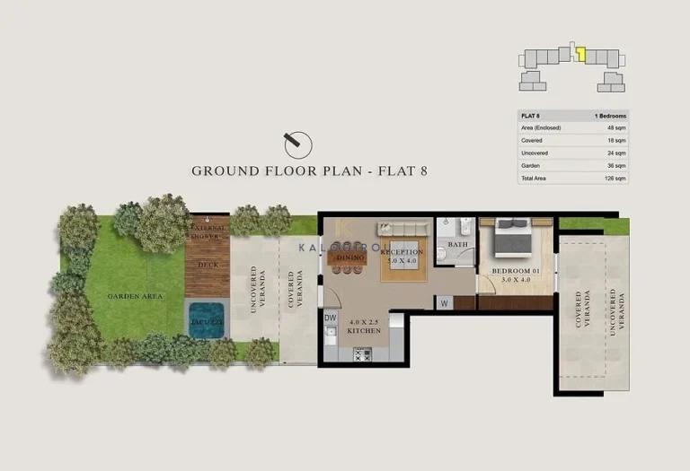 The apartment has 48 sq.m of internal covered area, an open plan kitchen, a living room, one bedroom and one main shower with wc. Furthermore, the apartment belongs 18sq.m of covered veranda and 24sq.m of uncovered veranda, while it also has a specious 36sq.m of garden which has a private Jacuzzi.