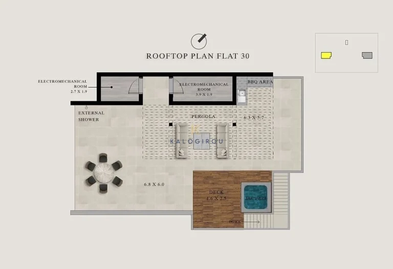The apartment has 107 sq.m of internal covered area, and it consists of an open plan kitchen, a living room, three bedrooms, one main bathroom with wc and one en suite shower with wc in the master bedroom. Furthermore, the apartment belongs 35 sq.m of covered veranda and 60 sq.m of roof top which has private jaccuzi.