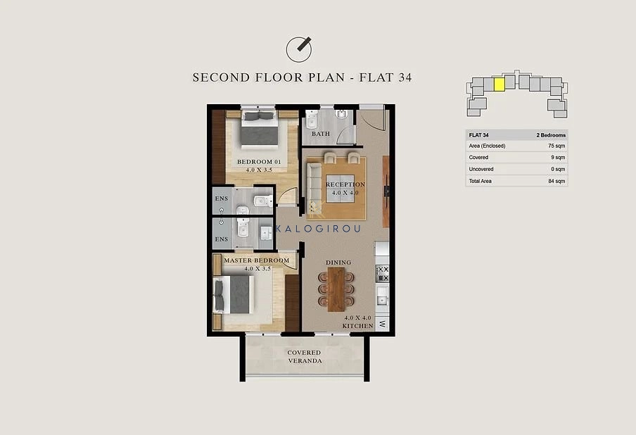 The apartment has 75 sq.m of internal covered area, and it consists of an open plan kitchen, a living room, two bedrooms with en suite shower with wc and one guest toilet. Furthermore, the apartment belongs 9 sq.m of covered veranda and communal swimming pool.