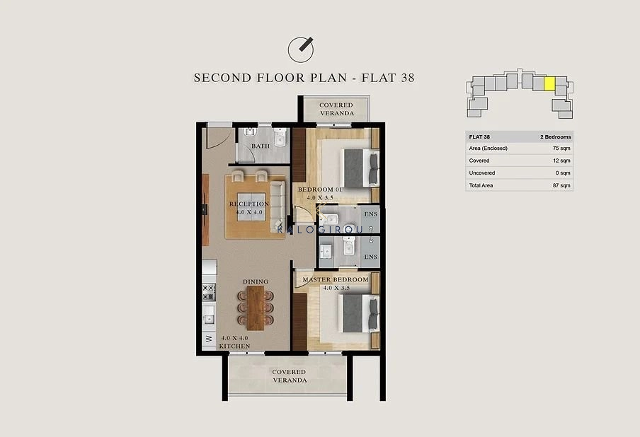 The apartment has 75 sq.m of internal covered area, and it consists of an open plan kitchen, a living room, two bedrooms with en suite shower with wc and one guest toilet. Furthermore, the apartment belongs 9 sq.m of covered veranda and communal swimming pool.