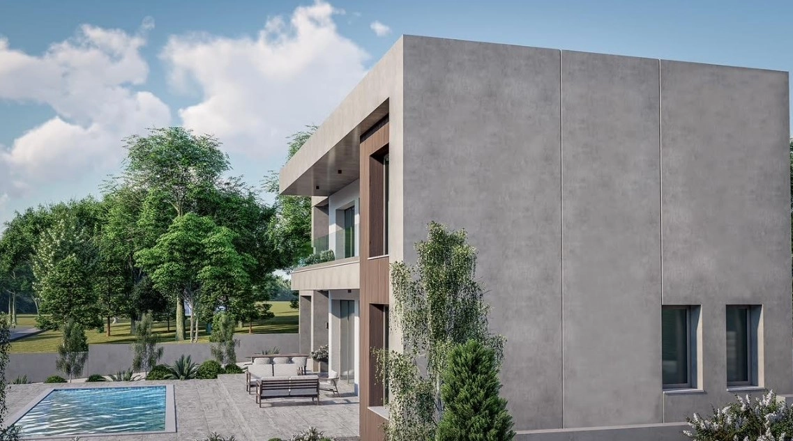 The villa features five generously sized bedrooms, each designed for comfort and privacy. Large windows flood the interiors with natural light, creating a bright and welcoming atmosphere. The villa also includes a private swimming pool, perfect for enjoying the Mediterranean climate and outdoor living.