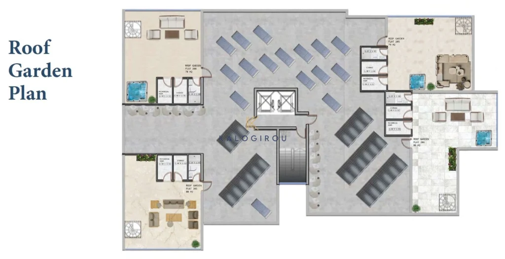 Apartment for sale in Kiti area, Larnaca. It consists of an open plan kitchen, dining area, living room, two bedrooms, 1 en suite shower, a main bathroom, covered veranda and roof garden. The roof garden consists of a siting area, storage, mechanical room. Also there is provision for a shower room with wc and jacuzzi. In addition, the property offers covered parking space on the ground floor.