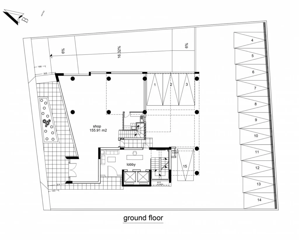 Sale of an office building in Linopetra area, Limassol, with quick access to the highway and a 1-minute drive from the sea. The project comprises of a ground floor shop with mezzanine and lobby area at the entrance and 4 floors with reception area. Each floor is 259 m2 with 72 m2 covered veranda. Each floor includes 7 offices and a lobby area. Total area is 1221m2, covered parking area – 22 parking spaces
