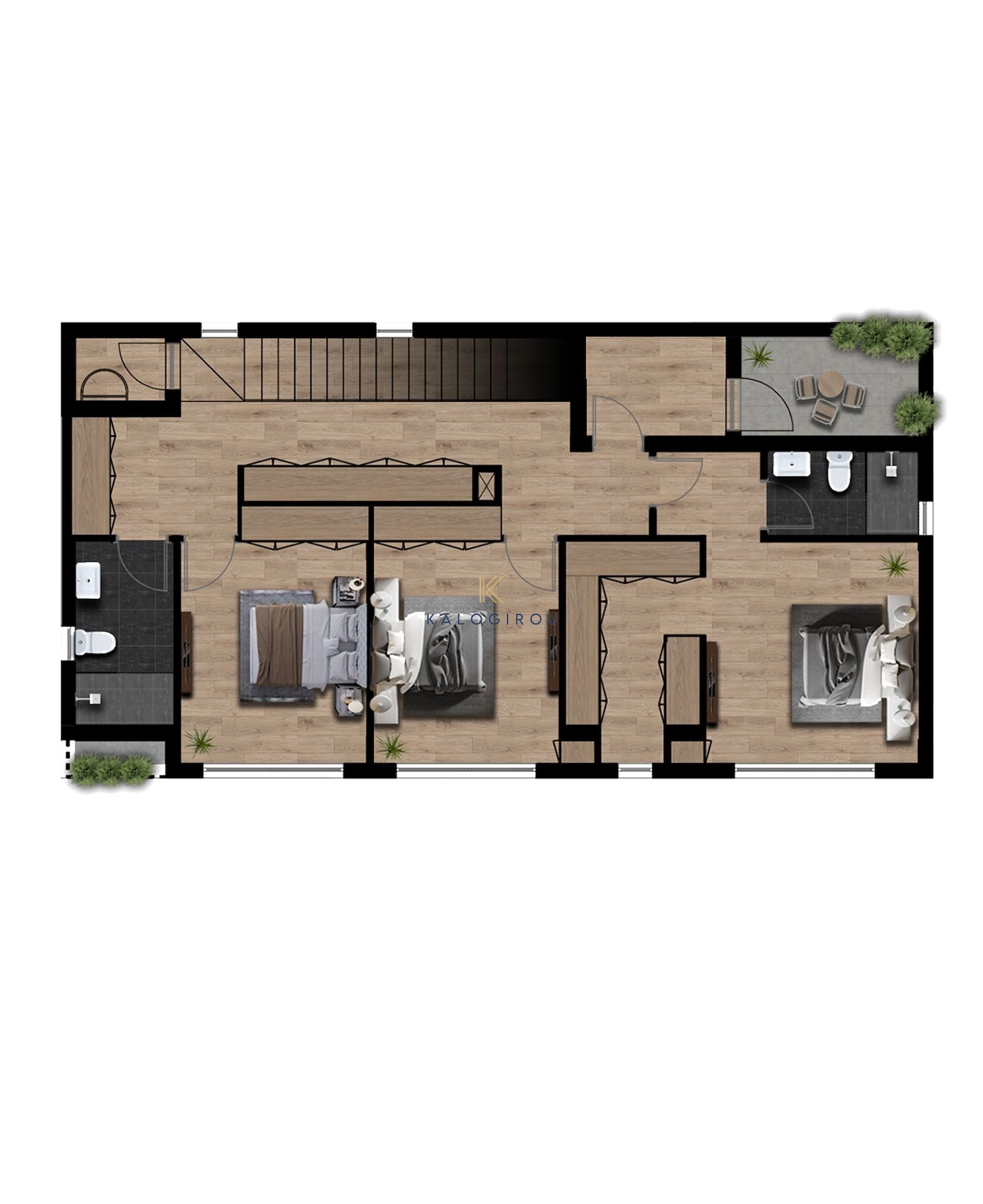 This modern development comprises 16 luxurious three-bedroom villas, complemented by a convenient mini market at the entrance to meet the residents’ daily needs. Designed with bioclimatic principles and incorporating cutting-edge innovations, the Villas are the perfect choice for those seeking homes that seamlessly blend modern aesthetics with energy efficiency. The project is rated Energy Class A,and each villa features its own independent photovoltaic system. The minimalist design emphasizes natural materials and textures, with striking geometric lines and thoughtfully integrated green spaces. Expansive windows invite natural light to fill the interiors, creating a seamless flow between indoor and outdoor living areas. The pool, open terraces, and lush gardens harmoniously coexist with the interior spaces, offering an atmosphere of relaxation and comfort. The villas feature spacious, ergonomically designed interiors that ensure practicality and ease of living.