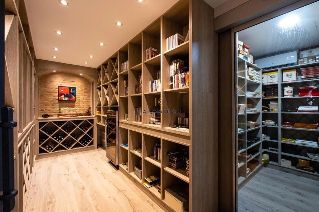 On the ground floor, you’ll find an expansive open-plan living and dining area with a fireplace, perfect for both family gatherings and entertaining. The kitchen is separated and fully equipped with top-tier appliances and an island for added functionality. A guest toilet, a large playroom, a wine cellar, and a cigar humidor are also located on this level, ensuring both relaxation and practicality.