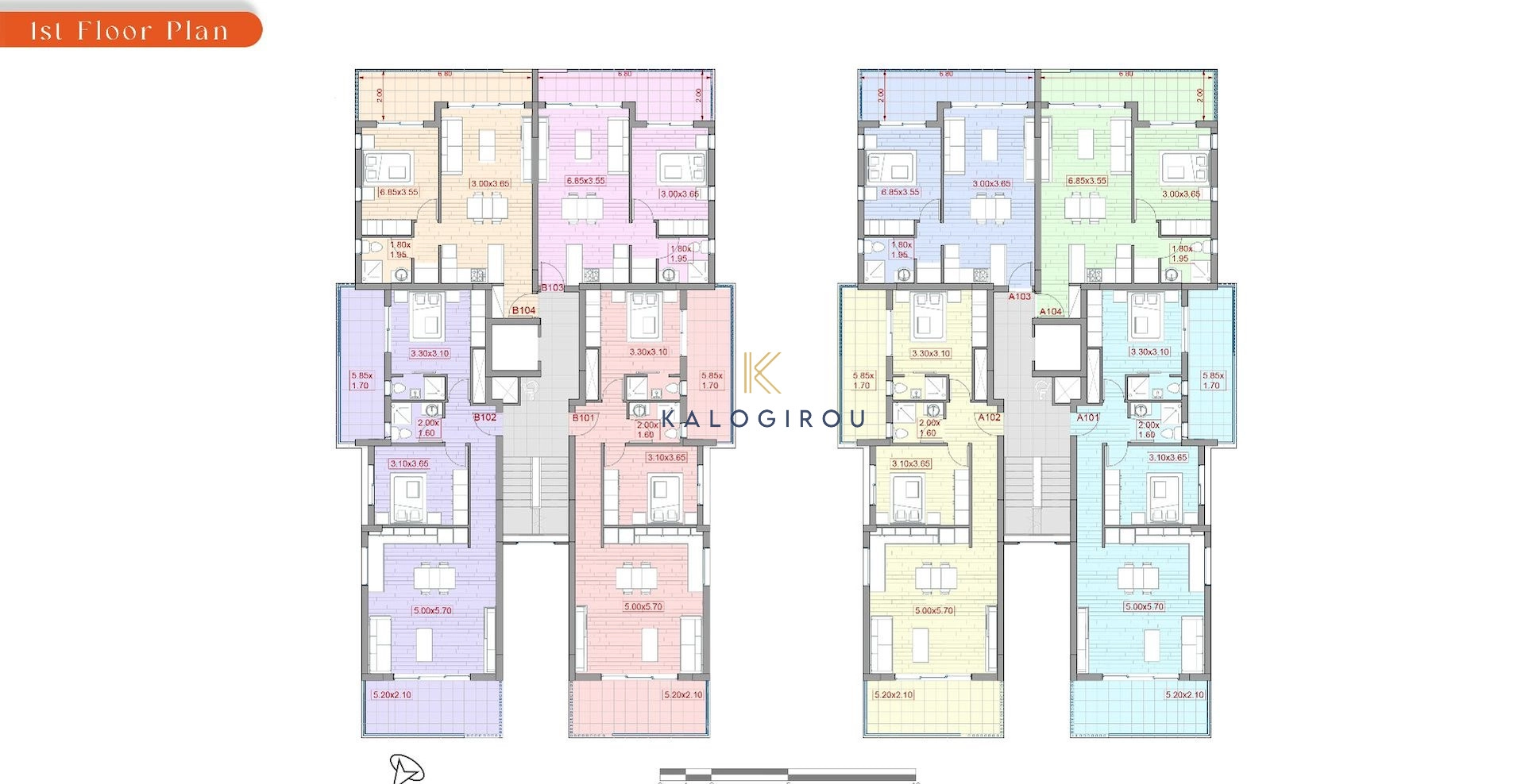 The luxury apartment for sale in Larnaca, in Livadia area has 76sq.m of internal covered area and it consists of two bedrooms, open plan kitchen, living room, one main shower with WC, one en – suite shower in the master bedroom, a covered parking, elevator and 24sq.m of covered veranda. The property also belongs storage room at the grand floor.