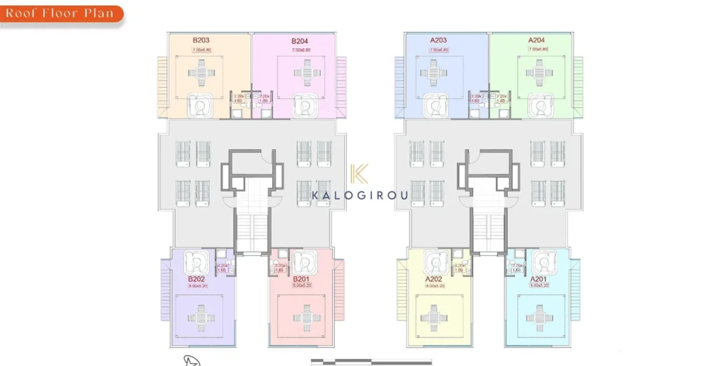 The luxury apartment for sale in Larnaca, in Livadia area has 76sq.m of internal covered area and it consists of two bedrooms, open plan kitchen, living room, one main shower with WC, one en – suite shower in the master bedroom, a covered parking, elevator and 24sq.m of covered veranda. The property also belongs storage room at the grand floor and a specious Roof Garden of 46sq.m, which has also a main shower with WC.