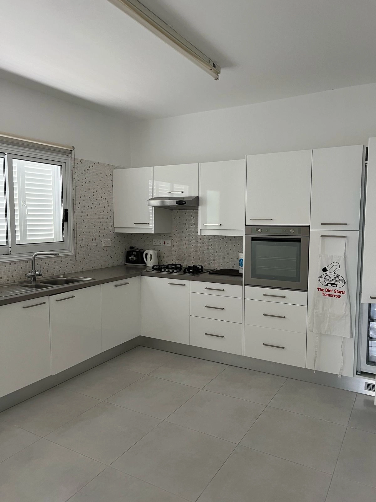 Fully-fitted contemporary kitchen with sleek white cabinetry and high-end appliances
