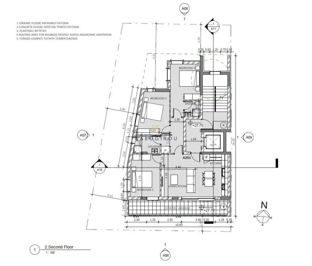 Second floor apartment for sale in New Marina-Port area, Larnaca. It consists of an open plan kitchen, living & dining area, a main bathroom (with shower), 3 bedrooms, en suite master bedroom with shower, and covered veranda. Furthermore, the property has access to a storage room on the roof top and a covered parking space on the ground floor.