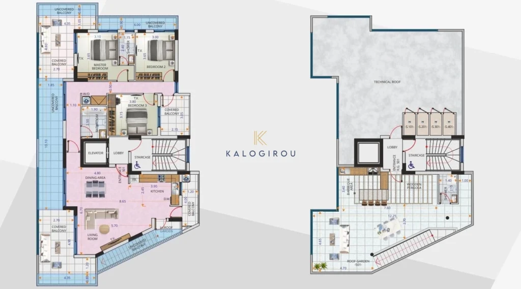 Apartments for sale in Larnaca, American Academy area. The property consists of three bedrooms and two rooms on roof, open plan kitchen, living room, one en suite shower in the master bedroom, one common bath with wc, private parking, storage, 45 sq.m covered veranda, 36sq.m of uncovered veranda and 72 sq.m of roof garden which belongs also one main shower with wc.