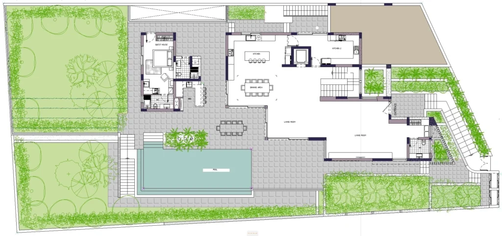 Located in the prestigious Germasoyia area, the project is a luxurious property set on 1200 sqm of land, with over 800 sqm of living space across three floors. It features 7 en-suite bedrooms, marble stairs and an elevator. Key amenities include a large swimming pool, gym, sauna, massage room, separate guest ensuite, BBQ area and spacious patios. The exquisite villa is equipped with state of the art facilities such as underfloor heating, a VRV system, ventilation, photovoltaics and a KNX smart home system, ensuring comfort and efficiency in a lavish setting.