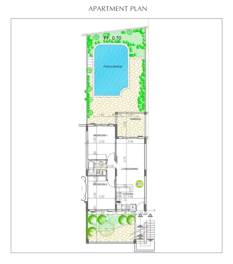 Apartment 11E is a luxurious property that consists of a large and light filled living/dining area and private garden with private swimming pool. The spacious balcony has a tremendous view of the fertile plains of Geroskipou in Paphos and the Mediterranean Sea.