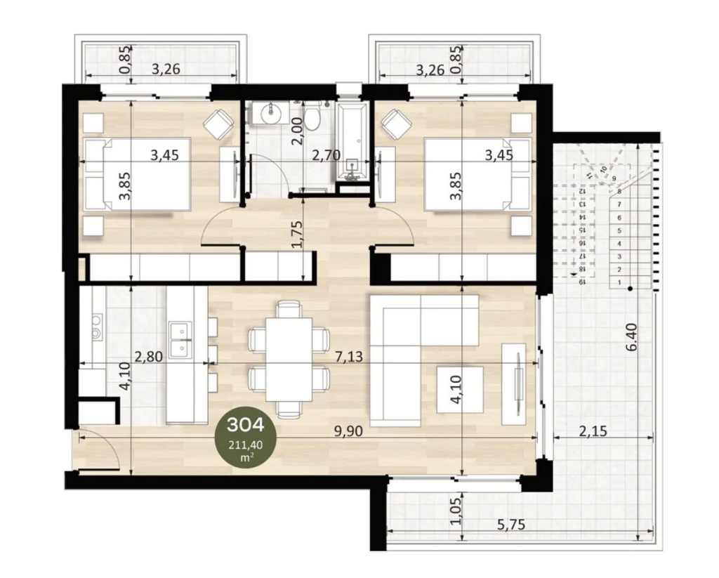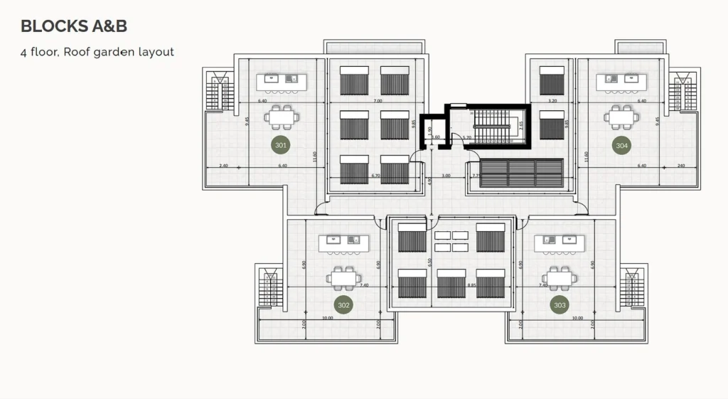 Two-bedroom penthouse a304, with a living area of 88.7 m² and a 86 m² roof garden, is located on the third floor of a three-storey building in Block A.