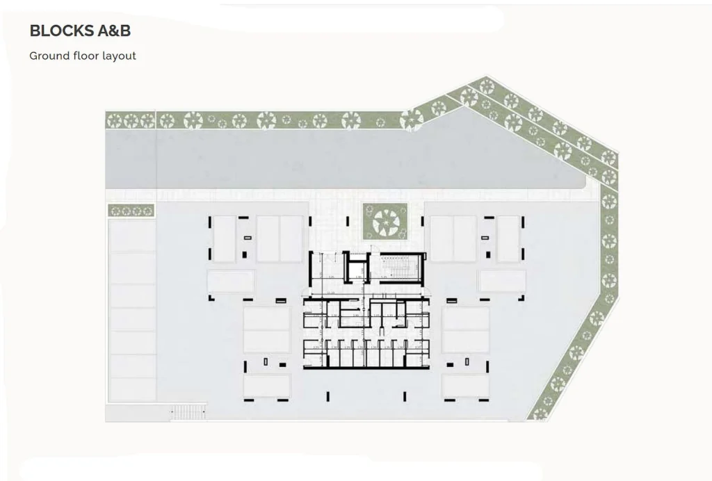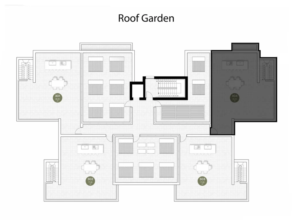 Two-bedroom penthouse a304, with a living area of 88.7 m² and a 86 m² roof garden, is located on the third floor of a three-storey building in Block A.