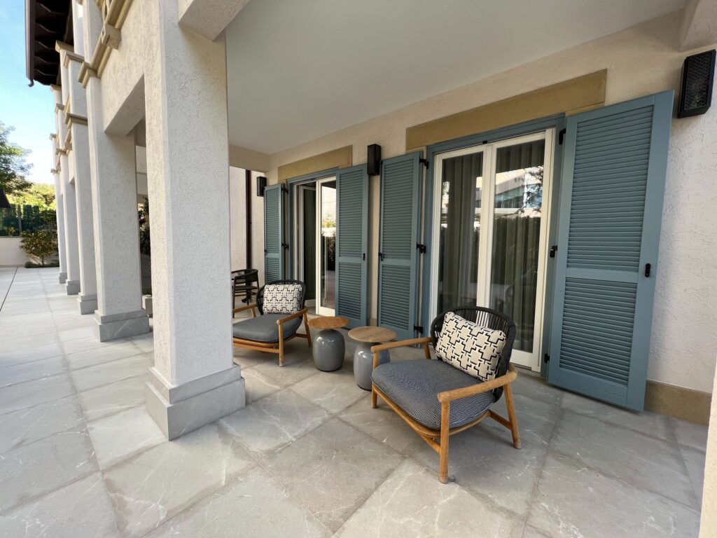 The first line, fully renovated to the highest standard 2-bedroom ground floor apartment, is located in the most impressive gated complex near the beach- The Residence complex is now available for rent. The complex has security 24/7, a large swimming pool, a gym area, private access to the beach, and beautiful, well-maintained mature gardens. The apartment is located 100 meters from the Mediterranean Sea. The covered area is 102sq.m, covered veranda is 16sq.m and plot 185sq.m. The property is fully furnished and equipped with electrical appliances. It has 2 bathrooms (showers), 2 spacious bedrooms with built-in wardrobes, a living room and dining areas, a laundry room, an open-plan kitchen, and windows (manual) shutters. Water pressure system, photovoltaic, underfloor heating(water), and VRV air-conditioning system (hot/cold). Also, there is a BBQ outside. Title deeds are available.