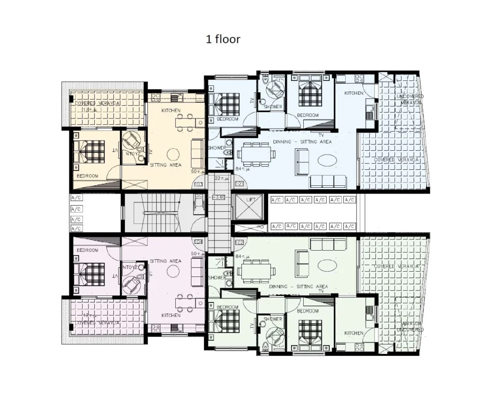 The planning solutions include single, double apartments with large balconies and three-bedroom apartments with spacious covered verandas. All apartments are finished with premium materials.